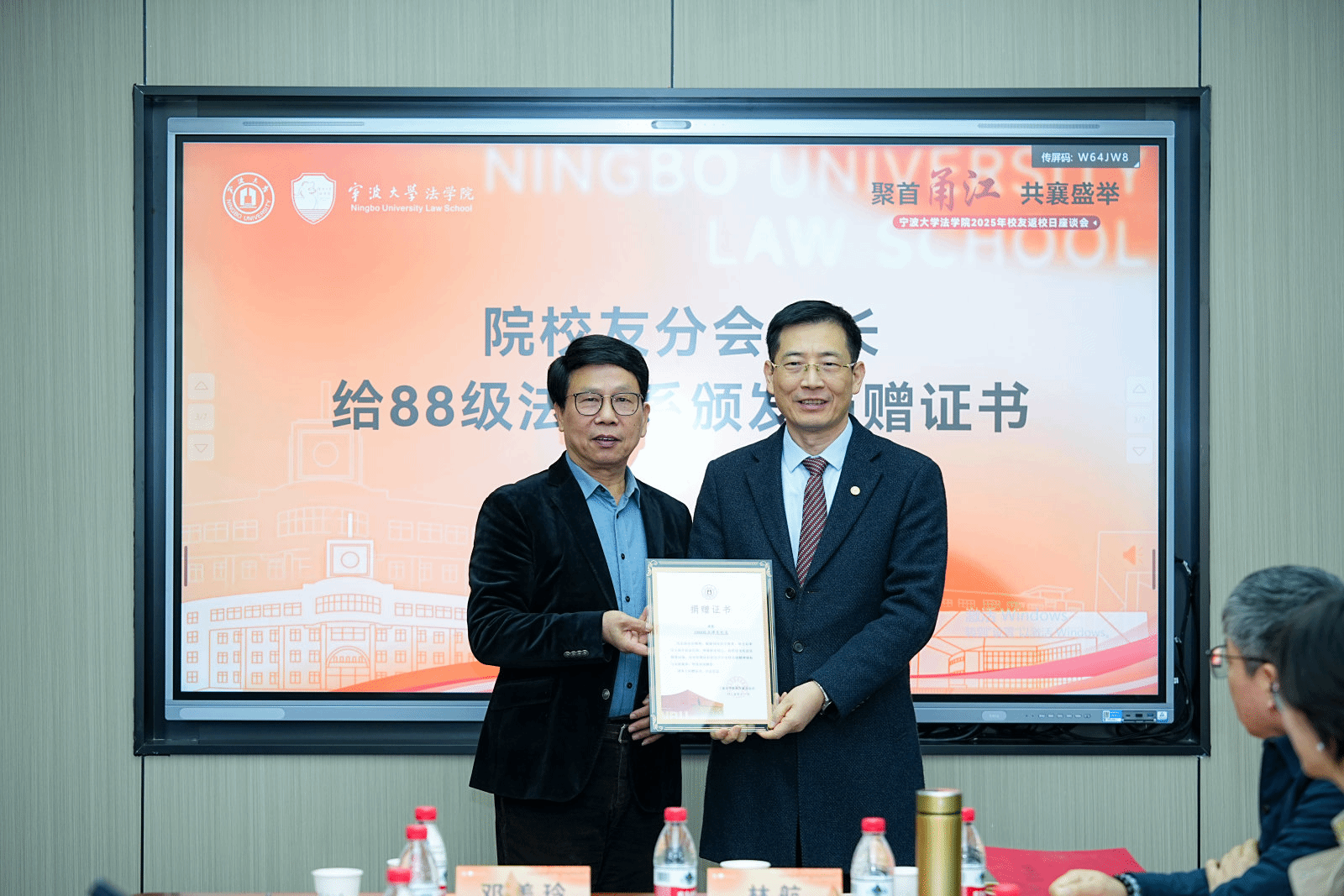 座谈会现场的温情高潮,定格在捐赠证书颁发环节。在全体与会人员的共同见证下,张炳生向1988级法律系校友代表叶明郑重颁发捐赠证书。此举旨在表彰该班级校友在毕业三十周年之际,以班级众筹形式募集善款,定向支持“宪法宣誓誓词墙”项目建设的暖心善举,彰显了校友群体反哺母院的深厚情怀。