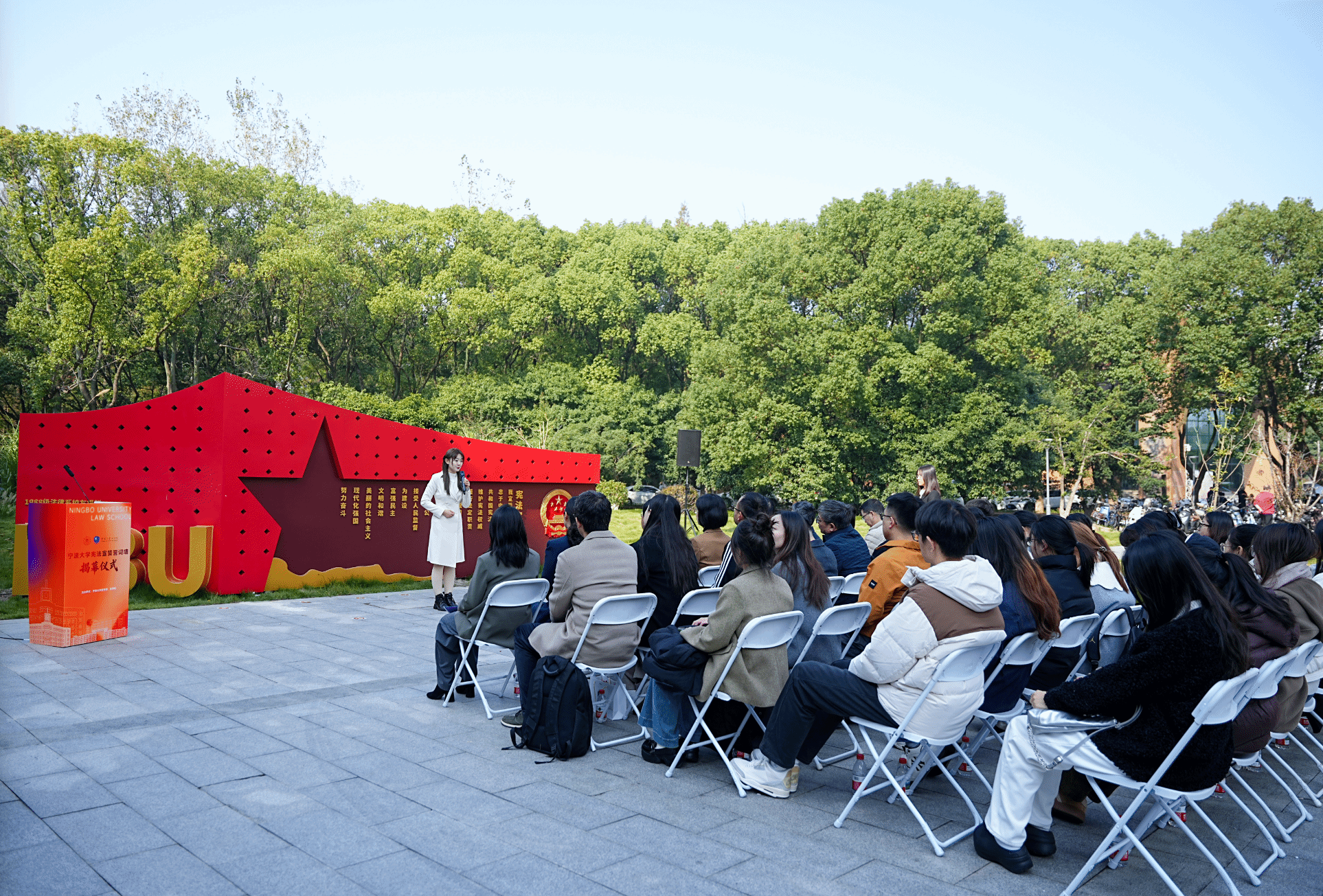 仪式的高潮在系列环节中逐步推进。在全体与会者的注视下,捐赠方校友代表和校方代表共同为宪法宣誓誓词墙墙揭幕。红绸缓缓落下,庄重的誓词墙面完整呈现,现场响起热烈掌声。随后的“青年说宪法”环节中,学生代表赵思琪分享了新时代青年对宪法的理解。