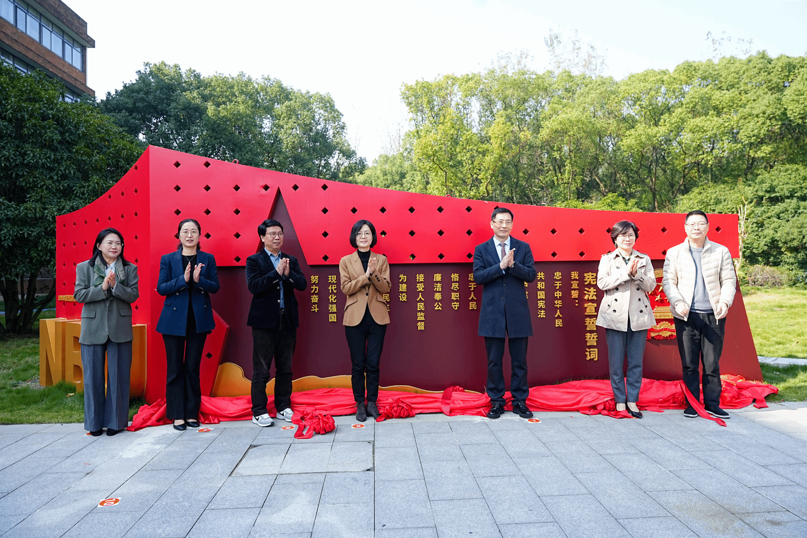 最令人动容的宣誓环节紧随其后。在校友分会会长张炳生的领誓下,全体人员面向誓词墙,右手举拳,庄严宣誓:“我宣誓:忠于中华人民共和国宪法,维护宪法权威,履行法定职责……”铿锵有力的誓言在校园中回荡,传递出宁大人弘扬宪法精神、履行宪法使命的坚定决心。