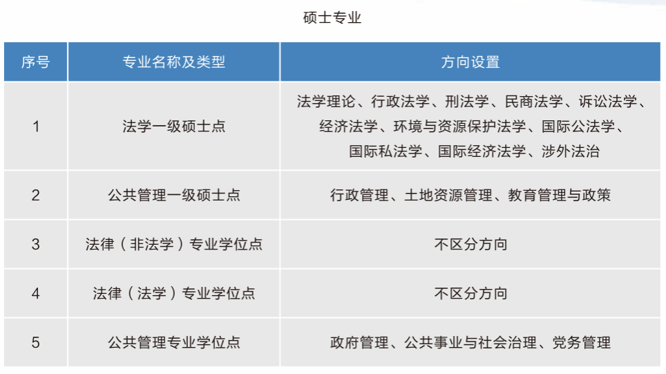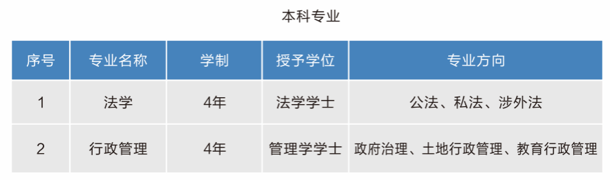 现设2个系(法律系、公共管理系)和2个本科专业(法学专业、行政管理专业)。2001年获浙江省第一个民商法学硕士学位点,2007年获法律硕士(JM)和公共管理硕士(MPA)2个专业硕士学位点;2010年与中国社科院法学所联合培养博士生;2011年获法学一级学科硕士点;2012年共建渔业经济管理二级博士点。法学理论、行政法学、刑法学、民商法学、诉讼法学、经济法学、环境与资源保护法学、国际公法学、国际私法学、国际经济法学、涉外法治11个二级学科硕士点,设有6个研究所。2018年获公共管理一级学科硕士学位授权点,现设行政管理、土地资源管理和教育政策与管理3个二级学科硕士点,设有公共管理研究所和地方政府治理、城乡治理与社会保障、人事人才理论与政策、土地资源管理、教育管理与政策等5个研究团队。