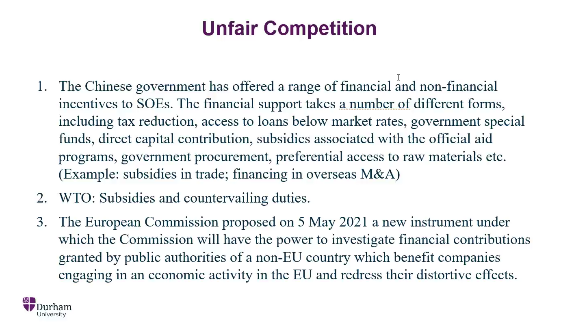 接着,杜教授带领学生进一步审视中国国有企业的一些热点问题,并以一些备受关注的问题做引子——国有企业为何在国际经济关系中引起特别的关注?国有企业所受到的疑虑是否能在现有法律框架中得到解决?部分国家担心我国的国有企业会造成不公平竞争,因为我国对国有企业有较多的激励,提供了包括减税、给予低于市场的贷款利率、直接出资、政府采购、优先提供原材料等在内的多种形式的支持。但是,目前的国际投资条约并未对企业的资金来源做规制,所以我国的做法并未违反条约。并且,我国为了减少国际上对于国有企业的疑虑,采取了一些措施,比如有选择地放宽了对某些部门的外国投资限制。