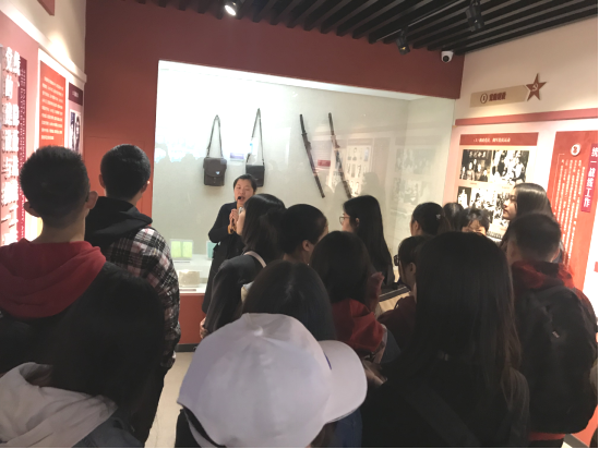 “我见青山多妩媚,料青山见我应如是。”沿着雕刻着四明山美景的黛瓦白墙一路向下,同学们来到浙东抗日根据地旧址。当时,革命先烈就是以四明山为中心,建立浙东抗日根据地,创办了《新浙东报》、开起浙东银行、发行抗币。革命火种在这片土地上燃起,为全国抗日之火助燃添薪,四明山被称为浙东抗日的“心脏”,梁弄镇也被称为浙东的“延安”。纪念馆中,吸引同学们注意的是展台内陈列着一把把红军使用过的“汉阳造”枪和早已生锈的大刀长矛。遥想当年,英勇的军人们就是用这些看起来毫不起眼的武器和敌人负隅顽抗、浴血奋战。