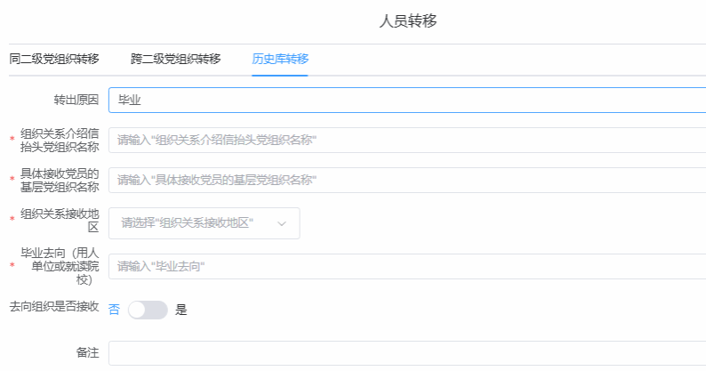 ,点击“同二级党组织转移”填写;转入校内其他学院,点击“跨二级党组织转移”填写;转入校外单位,点击“历史库转移”填写。
