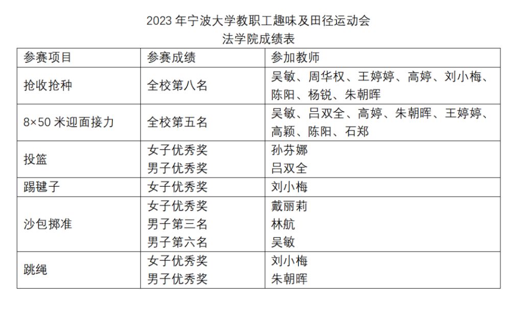 本次教职工运动会不仅激发了教职工们的运动热情,让大家在繁忙的工作之余释放压力,也增强了老师们的互动与联系,促进学院教师的团队凝聚力,为继续做好本职工作和助力学院发展积蓄能量。