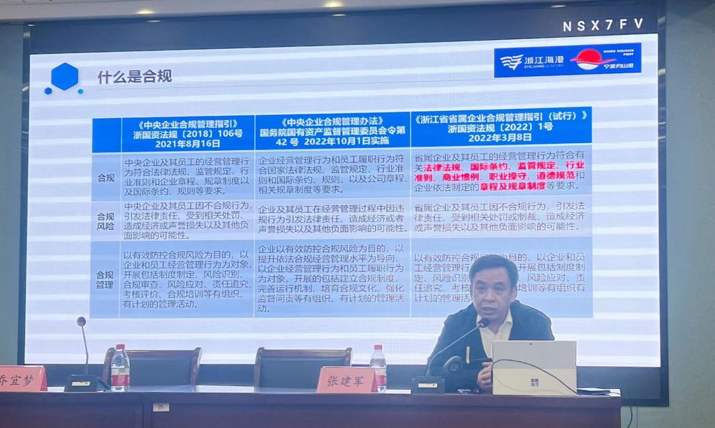 讲座伊始,张主任以“中兴通讯境外合规整改案”这一典型案例引出本次讲座的主题——“国有企业合规管理”。首先,通过对近十余年合规管理发展历程的解读,张主任详细分析了国有企业合规管理的大环境。国有企业合规管理的发展始于2006年国资委发布的《商业银行合规风险管理指引》,2016年国资委组织中国石油、中国移动、东方电气集团、招商局集团、中国中铁开展合规管理试点工作,2018年国资委发布的《中央企业合规管理指引<试行>》正式拉开了央企合规建设的序幕,合规管理政策在2022年升级为《中央企业合规管理办法》。为响应中央企业合规管理建设号召,浙江省将国企合规管理建设作为本年度省属企业法制建设的重点工作,全力推动省属企业的合规管理体系建设工作。