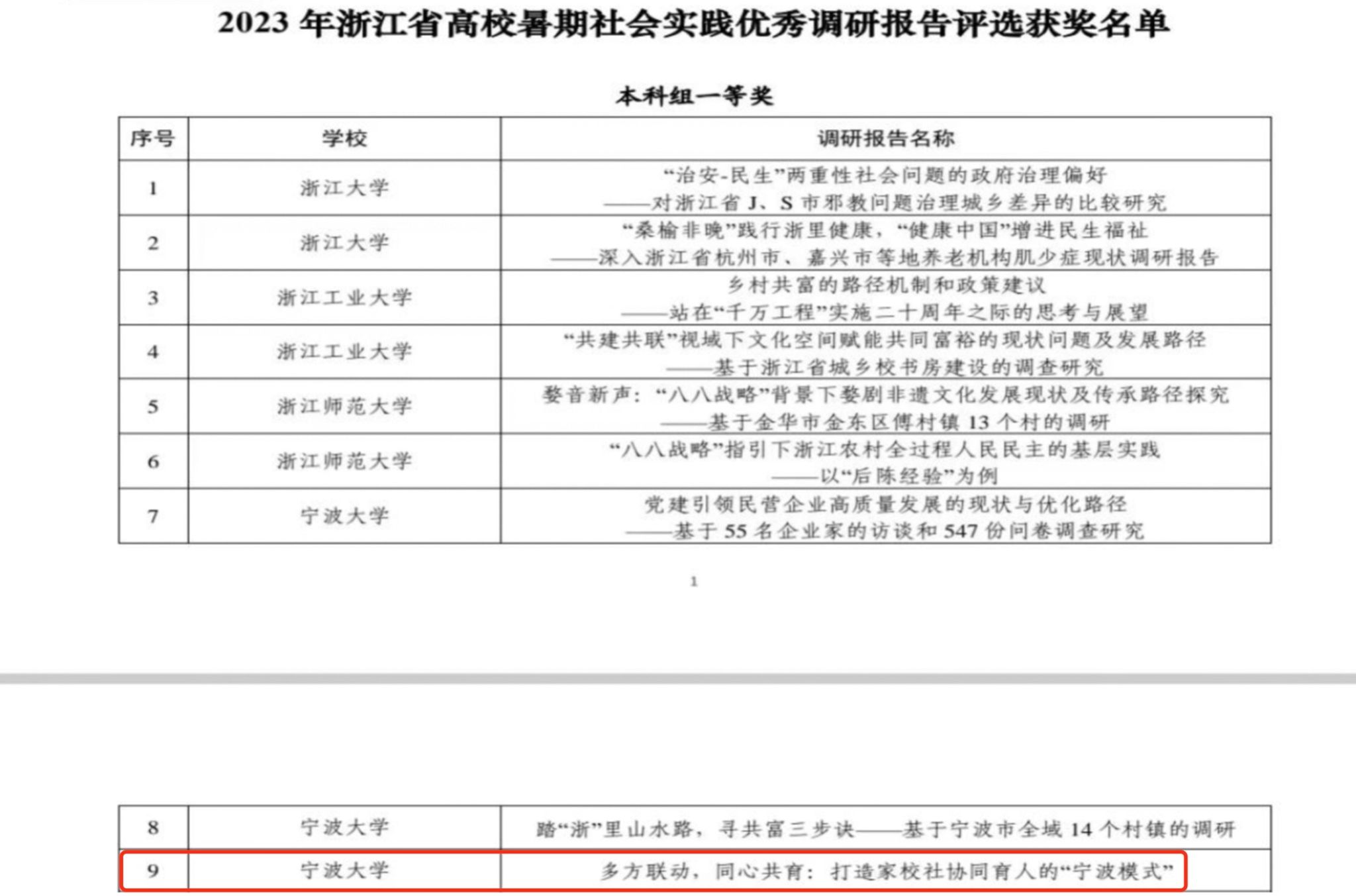 《多方联动,同心共育:打造家校社协同育人的“宁波模式”》暑期社会实践团队项目荣获本科组一等奖。