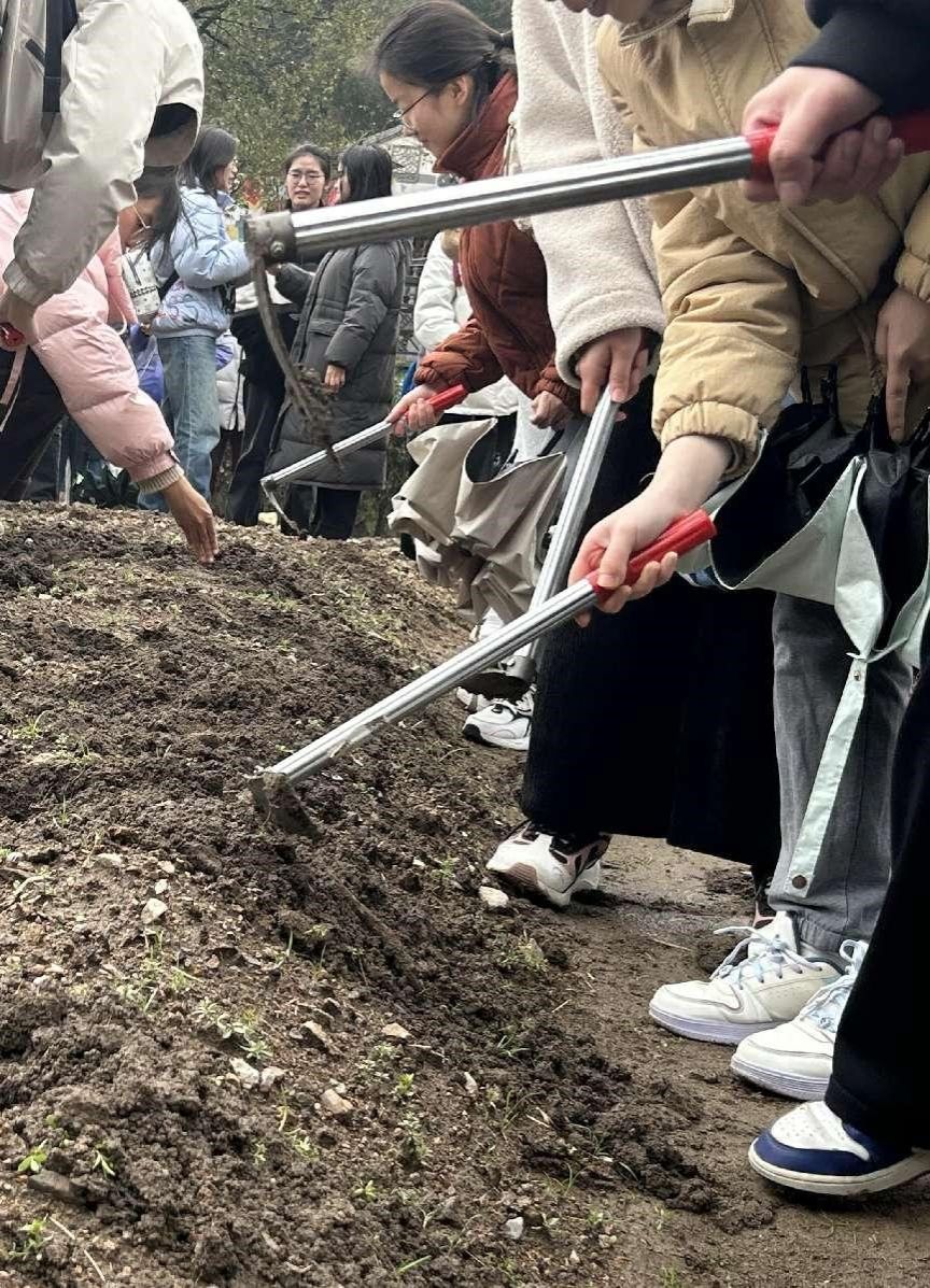 在九龙湖国际家园负责人姜红升的引导下,学生们抵达位于横溪村的共富工坊爱心田,主要进行了锄地和播种的学习。每个学生都充满了热情和活力,他们中有的用铁锹铲除杂草,有的负责播种玉米和土豆种子,每个人都各司其职,体验劳动的乐趣。劳动过程中,同学们也虚心向当地农民求教,确保每一粒种子都能获得发芽破土的机会。