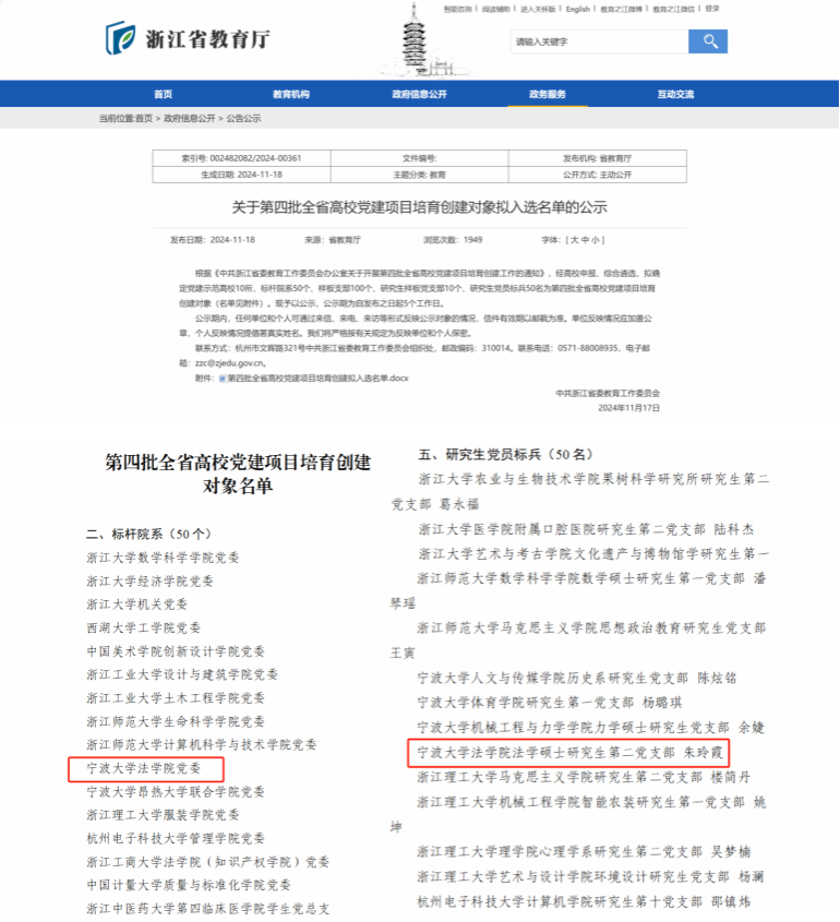 党委成功入选第四批全省高校党建标杆院系培育创建对象,法学硕士研究生第二党支部朱玲霞入选研究生党员标兵。