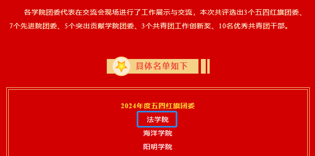 团委在过去三年中连续获评“先进院团委”,《“三维”协同,构建“卓越法治人才”实践育人模式》项目获得2024年度共青团工作创新奖。共青团工作年度评比包含基础工作量化考评和工作述职两部分,经过综合评定,404吧