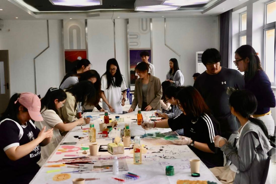 活动精心设置了“自由涂鸦”与“沙画制作”两个体验环节。在自由涂鸦区,铺展的纯白画布和丰富的绘画工具为参与者提供了自由表达的空间。同学们或低头构思,或即兴挥洒,通过画笔的跳跃和色彩的融合,在画布上细致勾勒或大胆泼墨,让内心情绪得以自然流露。现场氛围轻松融洽,参与者们互相传递颜料、欣赏作品,交流创作心得。
