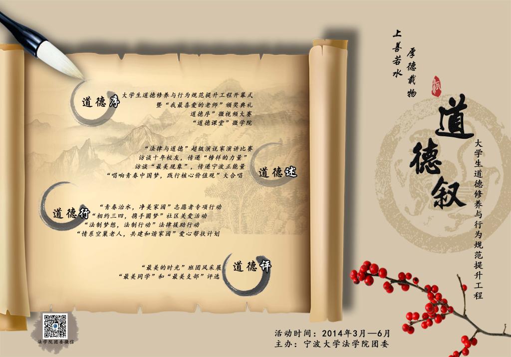 据悉,本次“道德叙”大学生道德修养提升工程由“道德序”、“道德述”、“道德行”、“道德评”组成,同学们通过听别人讲道德故事、自己说一说自己所经历的好人好事,自己亲自做一些志愿者活动、自己评价身边的道德人物,来参与整个道德修养提升工程。活动的主体内容有“道德课堂”微学院、“法律与道德”超级演说家演讲比赛、访谈“最美现象”,传递宁波正能量、访谈十年校友,传递“榜样的力量”、“青春治水,净美家园”志愿者专项行动等活动让道德修养指引行为规范,更让同学们的道德修养去感染和改善他人的道德认知和行为规范。