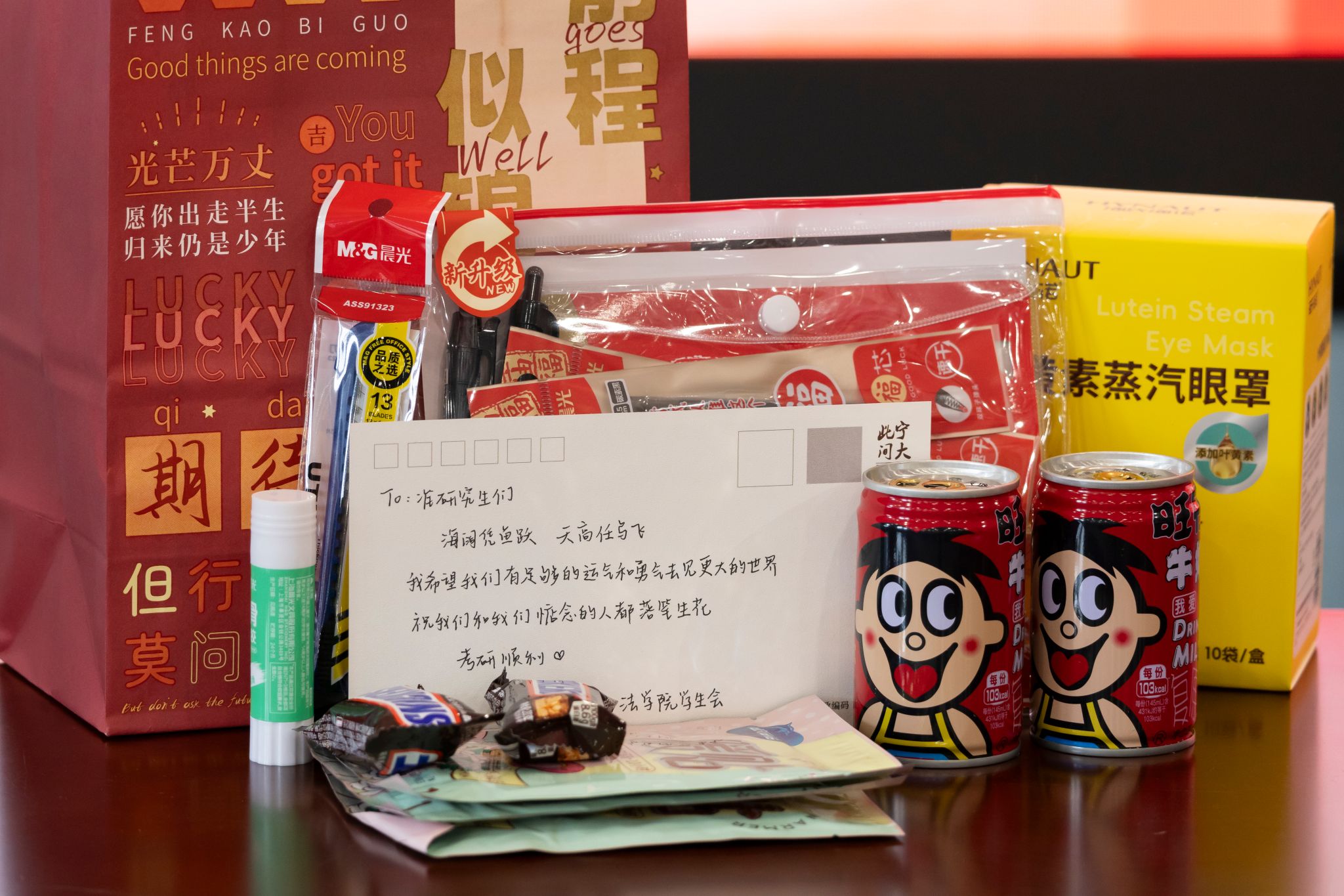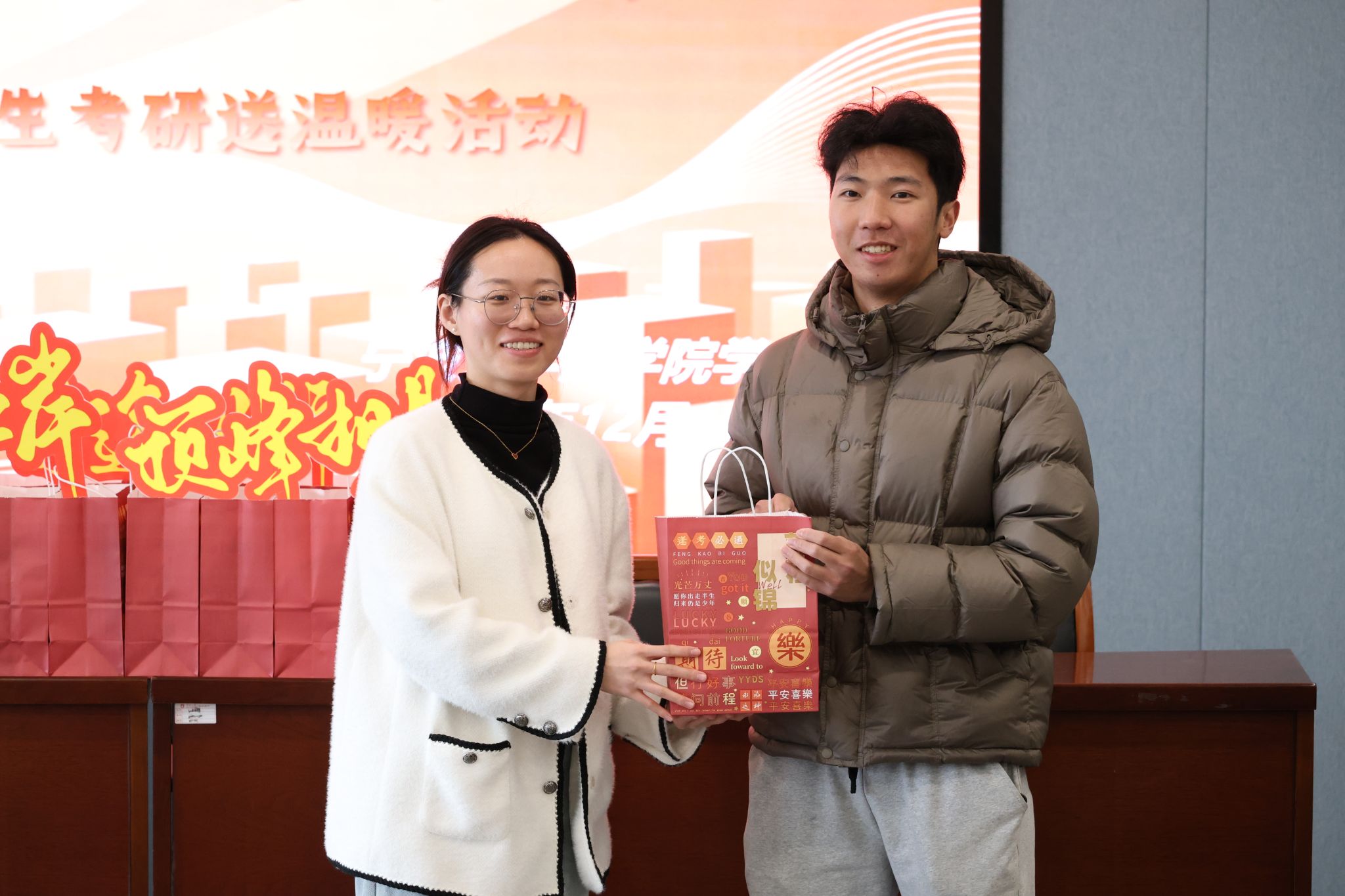 党委副书记谢果凰和学工办全体老师亲手发放考研大礼包,向考研学子送上诚挚祝福,叮嘱大家注意考前作息与保暖,与考研学子拍照留念,为他们注入备考信心。
