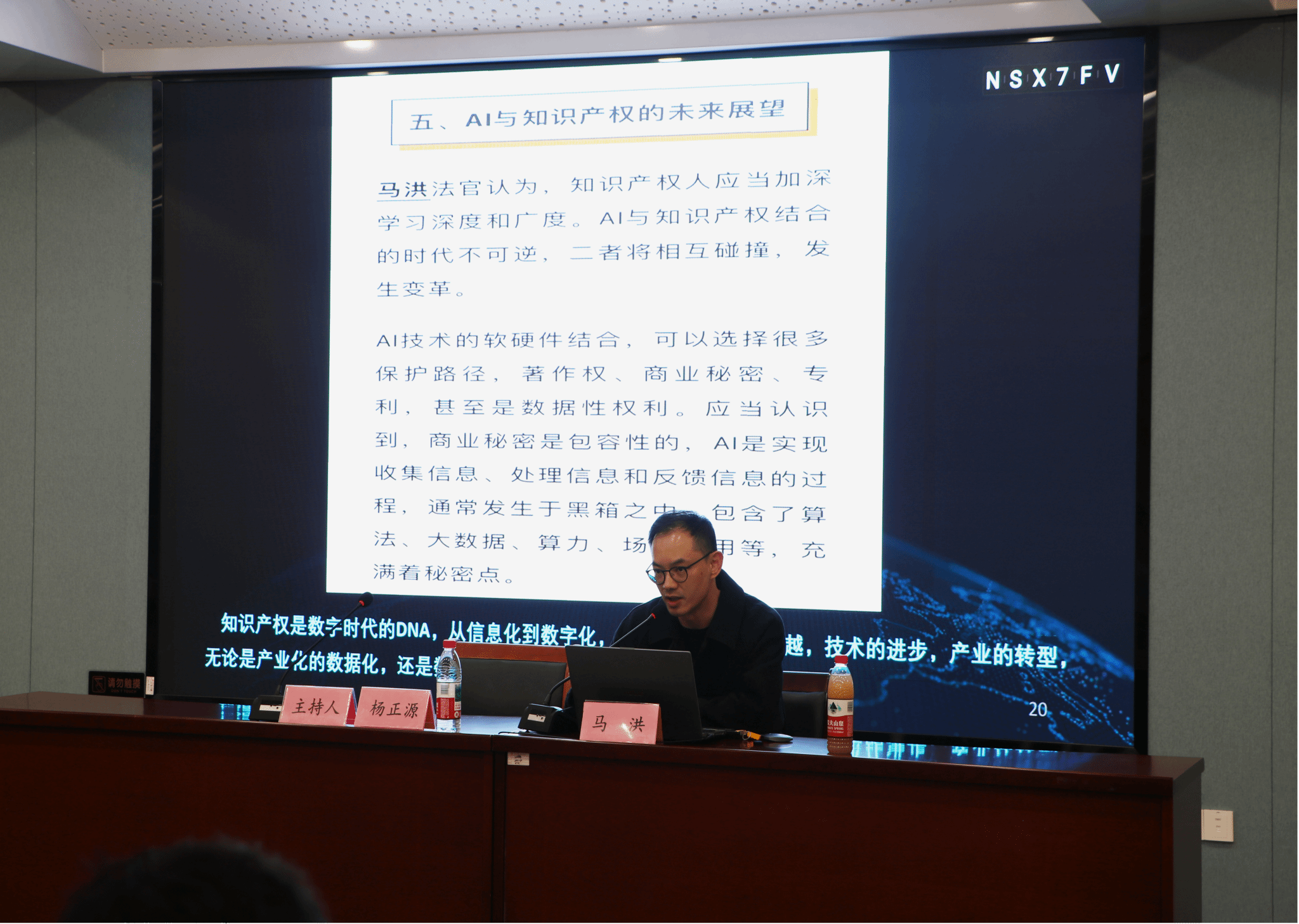 讲座伊始,马洪庭长系统梳理了人类社会从马车时代到汽车时代,再到当前无人驾驶时代的科技演进历程。他指出,随着科学技术的不断突破,各领域的法律规制也在持续发展与完善。以个人信息保护立法为例,他深入剖析了相关法律制度的形成与演进过程,并强调,以知识产权法为代表的现代经济法律体系,正是科技进步、文化创新、市场经济与法治建设深度融合的产物。