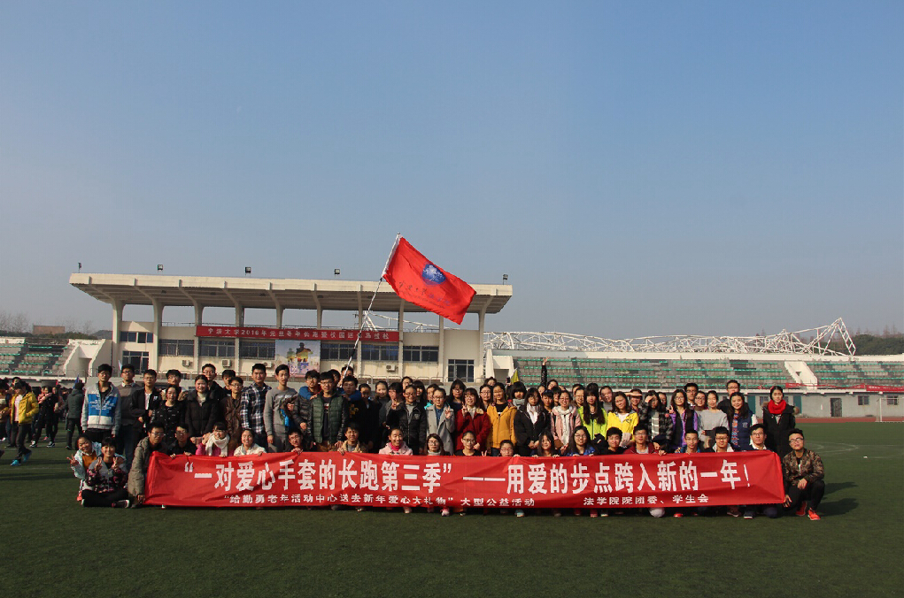 2016年1月1日,法院学子集合组成爱心长跑队,队伍从田径场出发,途经阳明路、北大门、祖望路、安中大楼等地,一路上大家在鲜红院旗的引领下,排成四路纵队激情飞扬的奔跑。长跑结束,大家纷纷表示希望通过参加这样的活动,以自己的行动为老年活动中心的老人们献出自己的一点爱心,让他们感受到严寒冬季中的一丝温暖。