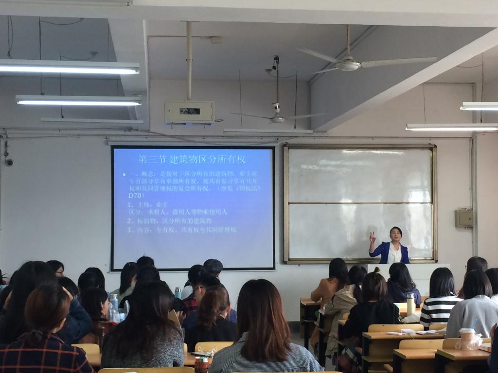 “一院一课”校级公开教学观摩活动在5-213教室开展,本次观摩课由朱亚芬老师主讲,主讲的内容是《民法学2》中的“建筑物区分所有权”部分,全校10多位老师参加了本次教学观摩活动。