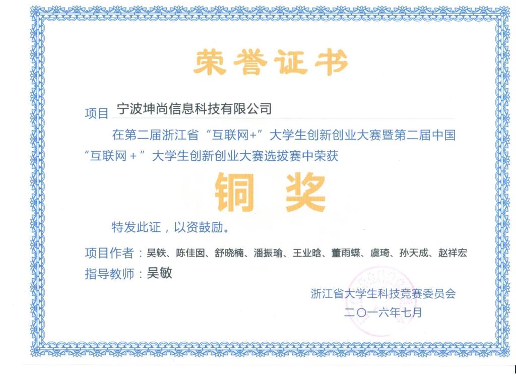 吴敏老师指导的参赛作品:宁波坤尚信息科技有限公司(参赛学生:吴轶、陈佳囡、舒晓楠、潘振瑜、王业晗、董雨蝶、虞琦、孙天成、赵祥宏)荣获全省铜奖。