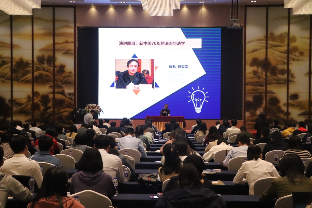 本次名家大讲堂安排了两场主论坛,邀请国内著名专家作主题报告。上午,特邀嘉宾、著名法学家陈甦研究员的报告是《新中国70年的法治与法学》,他是中国社会科学院学部委员,法学研究所研究员、博士生导师。国务院学位委员会第七届学科评议组(法学组)成员;中国法学会副会长,中国商法学研究会副会长。现任法学所所长,《法学研究》主编。享有国务院政府特殊津贴。