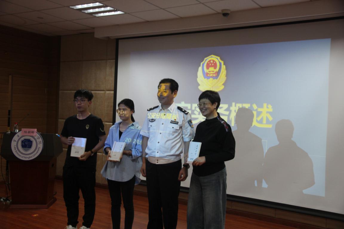 讲座开始前,陆区长向李学兰书记和学生代表赠送了宁波市公安局鄞州分局汇编的调解读本《警调三十六计》,讲座在热烈的气氛中拉开序幕。陆区长首先介绍了自己的求学经历和本次讲座的主题:“实务”即“实际操作问题”,主要是让同学们更加深入地了解现在公安机关的工作情况。在“对党忠诚,服务人民,执法公正,纪律严明”的训言指导下,人民警察队伍在新时代下被赋予了更加光荣且艰巨的任务。此后陆区长介绍了人民警察的警旗、警徽和警歌;也欣喜地介绍了中国人民警察节的设立——第一个中国人民警察节将在2021年1月10日到来,国家设立这一节日,深刻体现了国家对人民警察队伍的关怀和重视。