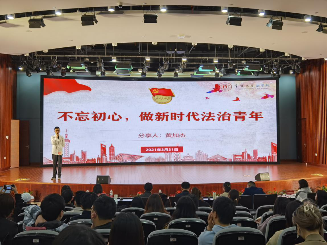 决赛中,黄加杰同学结合党史学习教育,以“法治”为主题,通过共产唤觉醒、法治之初心,共和再前进、法治之践行,共赴新时代、法治之愿景三个维度,带领在场师生共同回忆了法治建设的艰辛历程,展示了我国法治建设取得的壮丽成就,唤醒着青年法律人所肩负的责任和使命。他认为,青年是法治新时代的“后浪”,更是法治新时代的接班人,要培养社会主义法治思维;要学习法律知识,养成守法习惯;要掌握法律方法,参与法律实践;要尊重社会主义法律权威,以青春之名,书写法治时代的新篇章。