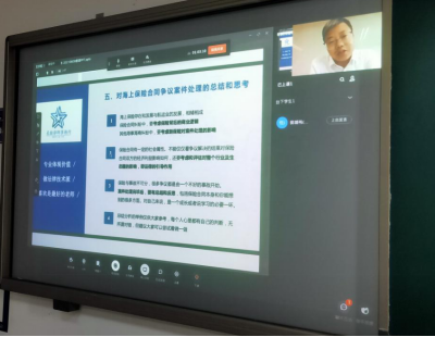 保险法课堂邀请到上海星瀚律师事务所的李洪伟律师,通过在线课堂方式和同学们交流《海上保险法律实务》。在课堂上,李律师介绍了海上保险的分类和条款、市场参与主体、海上保险的特殊制度,也通过案例分析了海上保险实务的最新发展,最后分享了他本人从事海上保险及相关法律实务的思考和心得,建议同学们加强学习,在学习中找寻自己感兴趣的领域,深耕细作。本次在课堂教学活动中邀请到实务人士的参与和分享,也是404吧