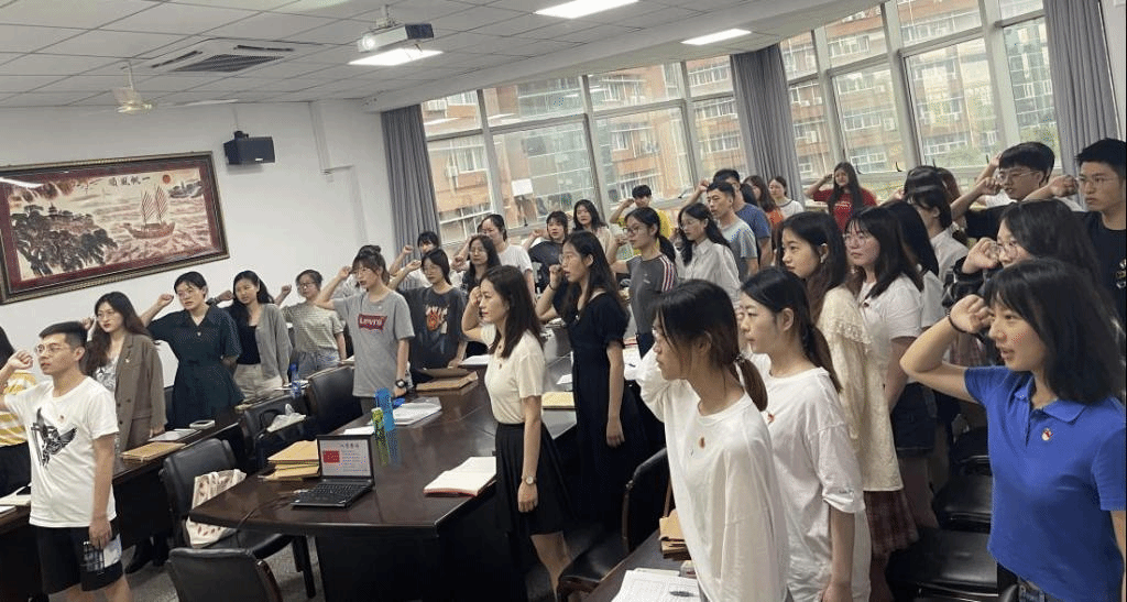 活动伊始,支部副书记带领全体党员,佩戴党徽,面向党旗,庄严地举起右臂、紧握右拳。“我志愿加入中国共产党......随时准备为党和人民牺牲一切......”入党誓言声声铿锵,句句千钧,叩问初心使命、坚定理想信念。