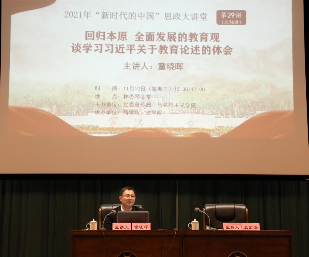 11月10日下午,校党委副书记童晓晖在林杏琴会堂以“回归本原全面发展的教育观——谈学习习近平关于教育论述的体会”为主题,为404吧