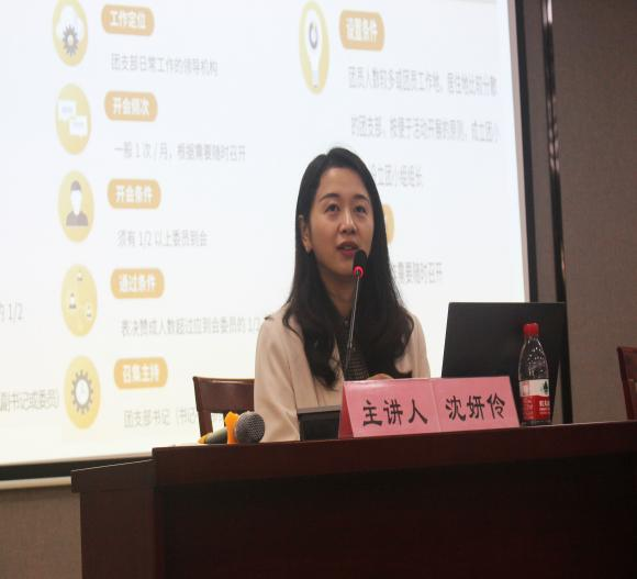 讲座伊始,沈妍伶老师与同学们进行积极互动,就“三会两制一课”展开提问和讨论,从而引出基层团支部工作职责及设置这一内容,向全体学员介绍了基层团支部的成立工作指引、工作职责和基层团支部支部委员的任职条件、职责及换届,最后播放趣味小视频对以上所讲的内容进行巩固复习。讲座的第二部分沈妍伶老师从更具体的执行层面出发,详细阐述了团员发展条件及流程、团员推优入党、主题团日活动开展要求等有关404吧