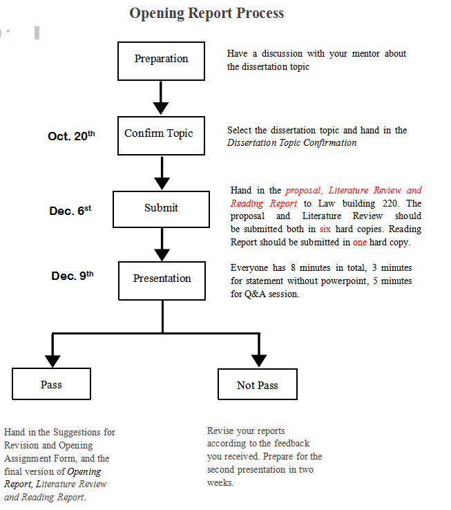 Please hand in the proposal, Literature Review and Reading Report to Law building 220 before 10:00 Thursday morning (December 6, 2018). The proposal and Literature Review should be submitted both in six hard copies. Reading Report should be submitted in one hard copy.