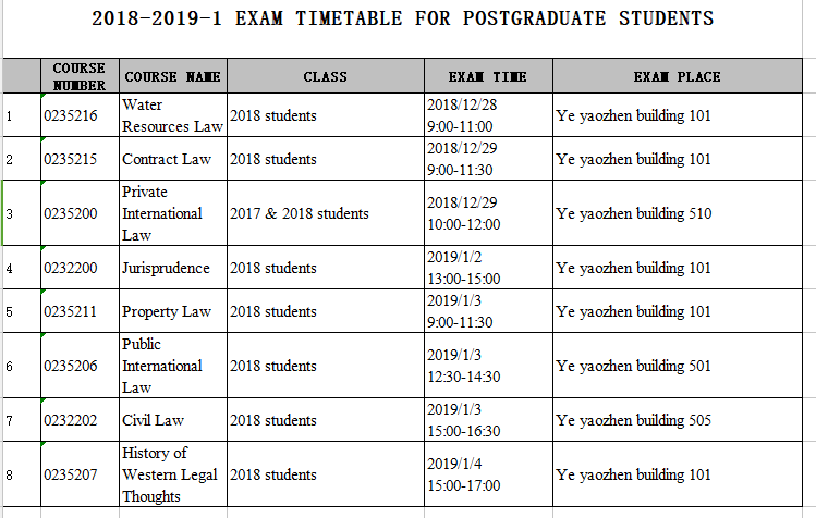 The examination time and place is shown in the table below, please pay attention! The examinations of other courses are arranged by the lecturer, and please confirm with lecturer.